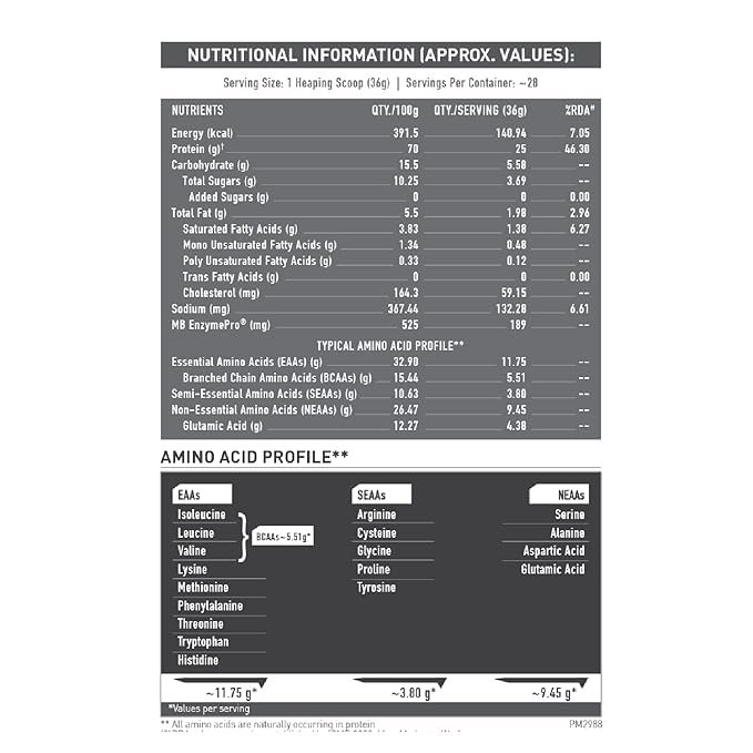 - ENHANCED ABSORPTION FORMULA (EAF): MB Biozyme Performance Whey Protein ensures 50% higher protein absorption & 60% superior BCAA absorption compared to other whey protein supplements. This proprietary formulation of MB is international patent-applied & lowers any possible protein digestion issues